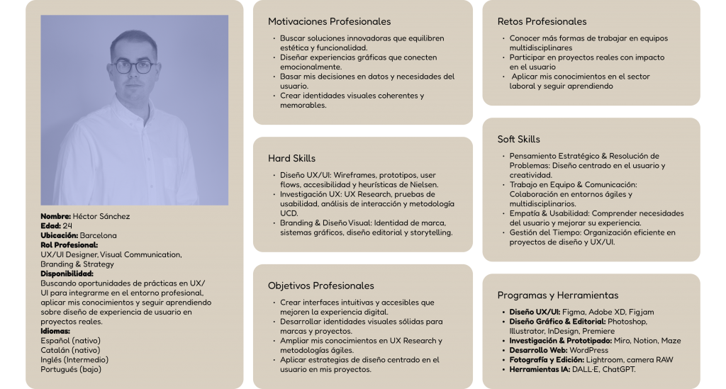 Recién graduado en diseño con una sólida base en UX/UI, branding y comunicación visual. Me apasiona crear soluciones innovadoras que equilibren estética y funcionalidad, diseñando experiencias gráficas que conecten emocionalmente con los usuarios. Cuento con experiencia inicial en proyectos centrados en la mejora de la experiencia digital, desarrollando interfaces intuitivas, accesibles y alineadas con los objetivos estratégicos de marca. Mi enfoque se basa en la investigación, aplicando metodologías como el diseño centrado en el usuario, pruebas de usabilidad y análisis de interacciones para generar productos visualmente impactantes y funcionalmente eficaces.